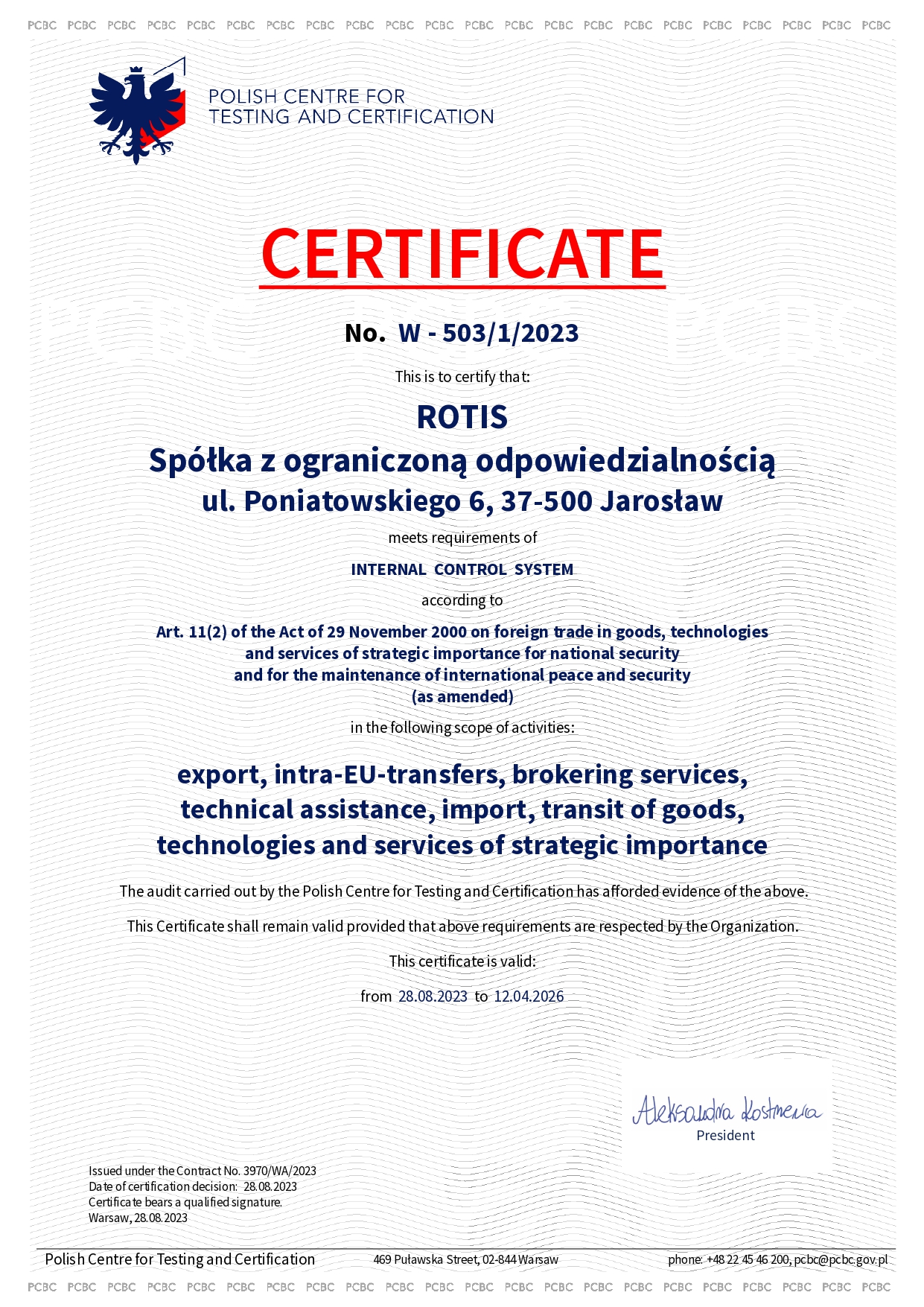 Dzięki wdrożeniu Wewnętrznego Systemu Kontroli w ROTIS możemy uczestniczyć w obrocie międzynarodowym towarami o znaczeniu strategicznym, takimi jak towary militarne, uzbrojenie, amunicja, mat. wybuchowe, oraz produkty podwójnego zastosowania (tzw. dual-use).